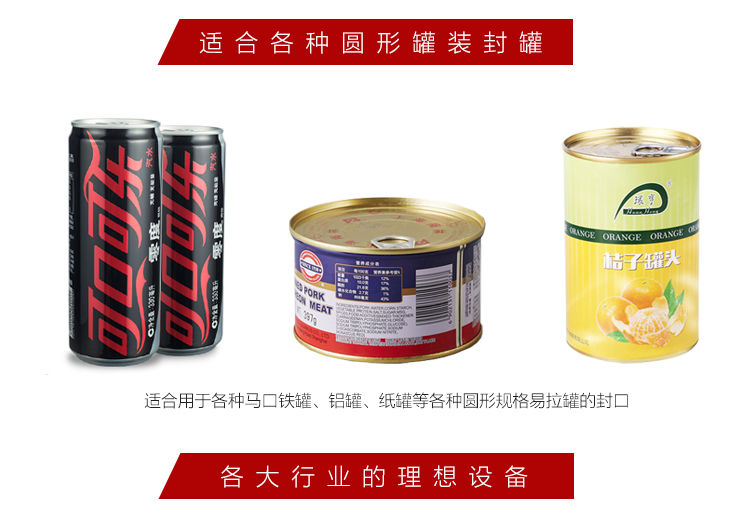 4、适用于各种马口铁罐、铝合金罐、纸罐等各种圆形规格易拉罐的封口,操作简单易学,是食品、饮料、制药等行业的理想设备